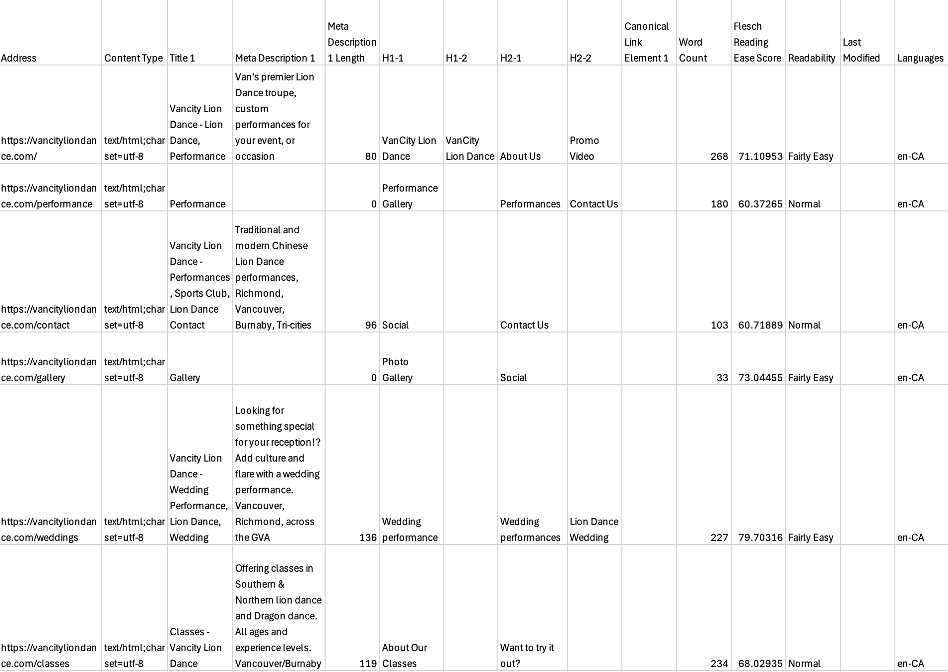 The content audit for Vancity Lion Dance aims to enhance SEO, usability, and the overall user engagement by addressing key areas that impact the website’s performance. Comprehensive analysis of https://vancityliondance.com revealed several issues that impact the website. The audit includes detailed assessments of the pages, media, and metadata, allowing for targeted strategies that drive both performance and user satisfaction.