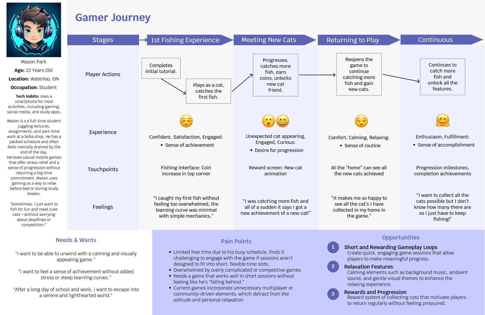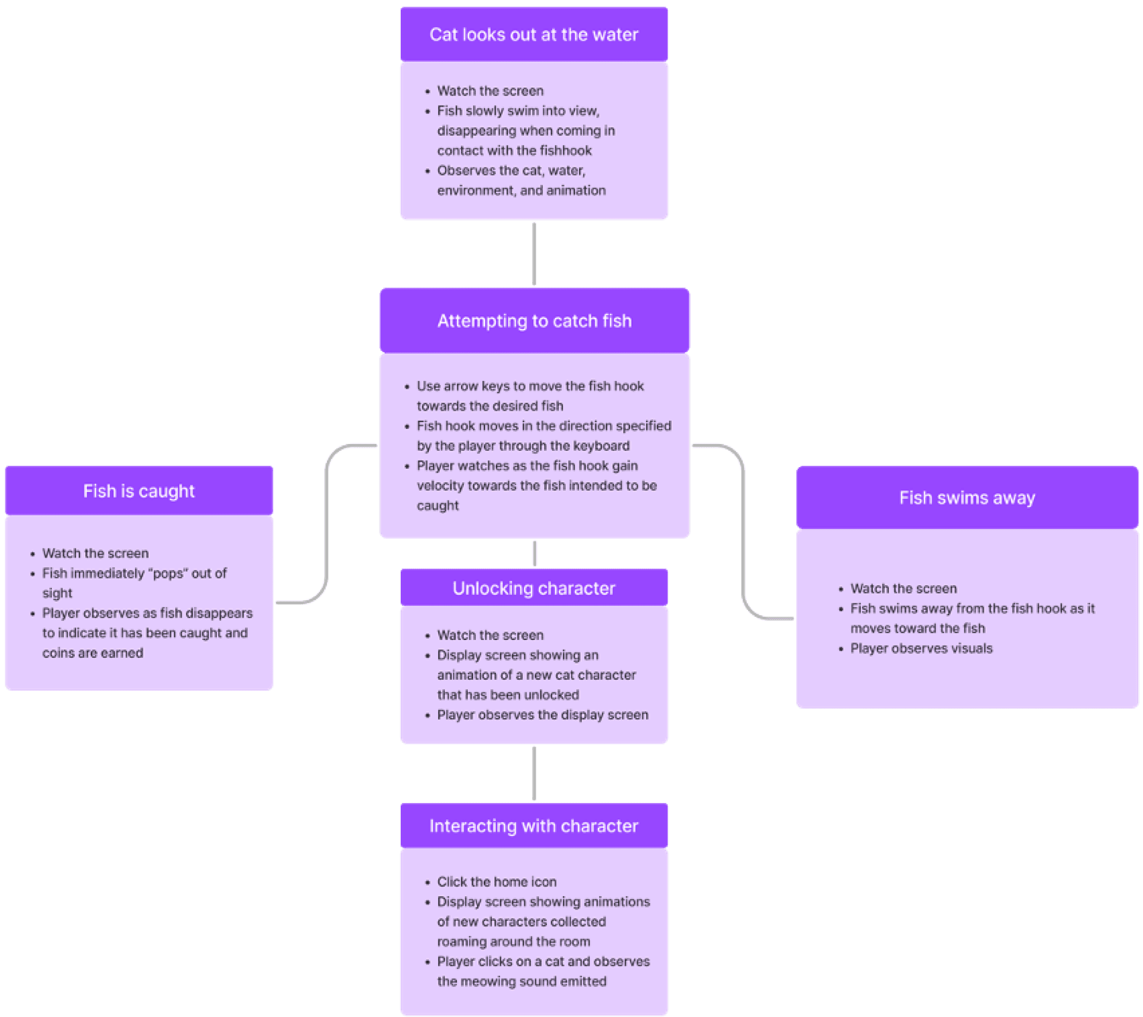 The main gameplay loops and arcs of Fishy Cat, showcasing how players interact with the game and progress through its core mechanics. it is structured to combine intuitive mechanics, satisfying progression, and relaxing visuals, emphasizing Fishy Cat's focus on creating a calming yet engaging experience.
