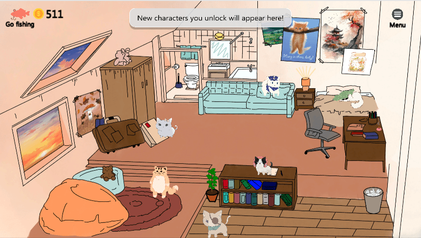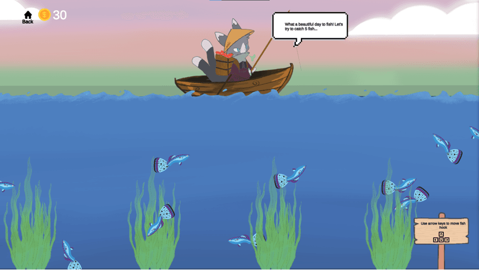 You play as a charming feline protagonist in a beautiful, calming environment to catch a variety of fish, earn coins, and meet new cat friends along the way!